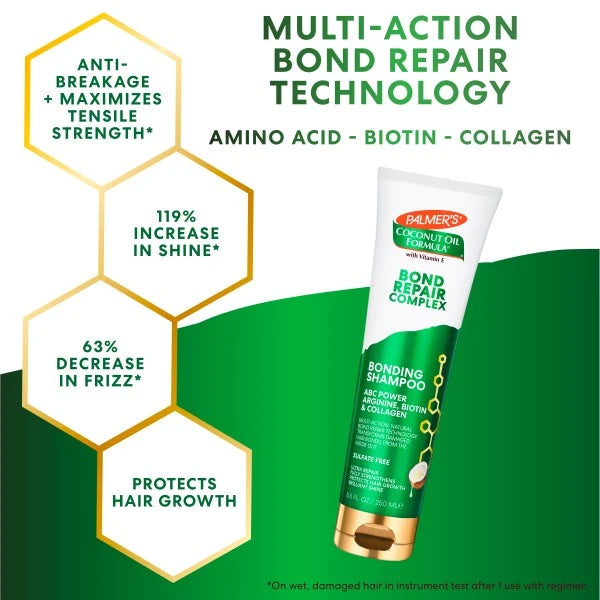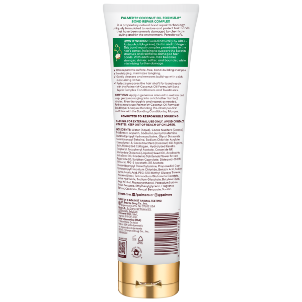 How to Use: Apply a generous amount to wet hair and scalp, gently massaging into a rich lather for 1 to 2 minutes. Rinse thoroughly and repeat as needed. For best results use Palmer’s® Coconut Oil Formula® Amino Bond Repair Complex Bonding Pre-Shampoo first and follow with the Bonding Conditioning Masque