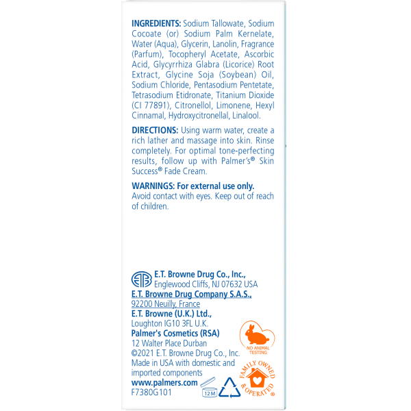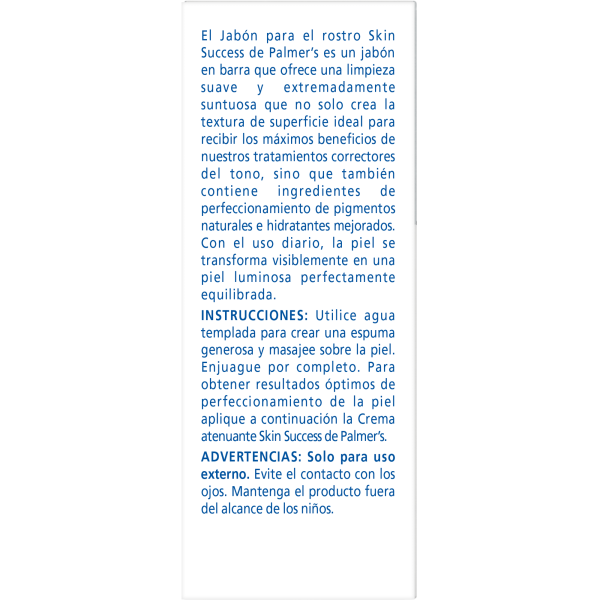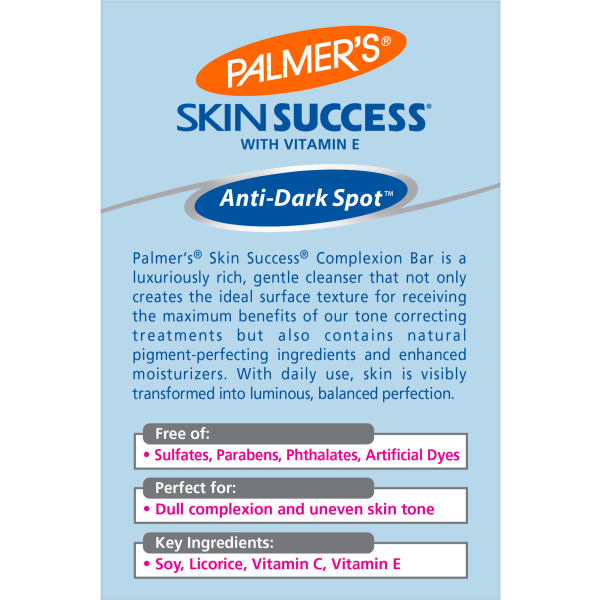 Palmer's Skin Success Anti-Dark Spot Complexion Bar is a gentle cleansing bar that not only creates the ideal surface texture for receiving the maximum benefits for our tone correcting treatments, but also contains natural pigment-perfecting ingredients and enhanced moisturizers. With daily use, skin is visibly transformed into luminous, balanced perfection.