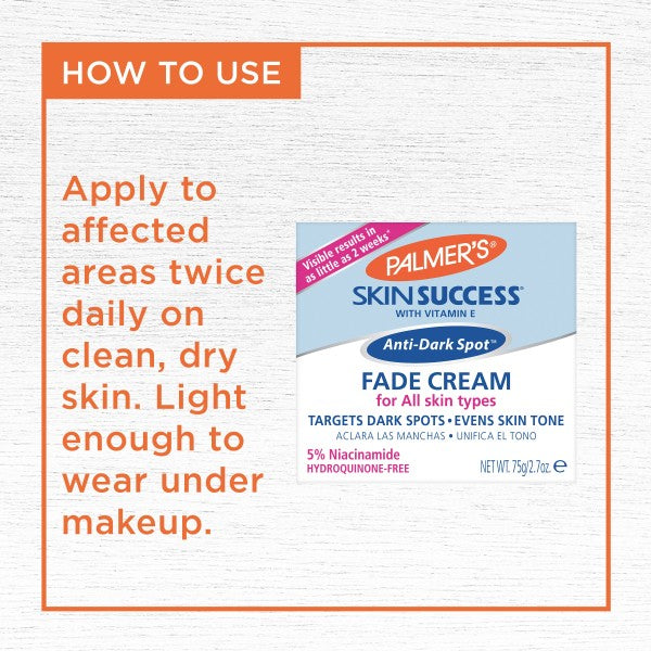 Palmer's Skin Success Fade Cream gives you a flawlessly radiant complexion by effectively correcting discoloration such as dark spots, age spots and uneven skin tone.