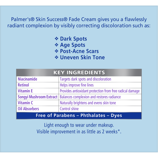 Palmer's Skin Success Fade Cream gives you a flawlessly radiant complexion by effectively correcting discoloration such as dark spots, age spots and uneven skin tone.