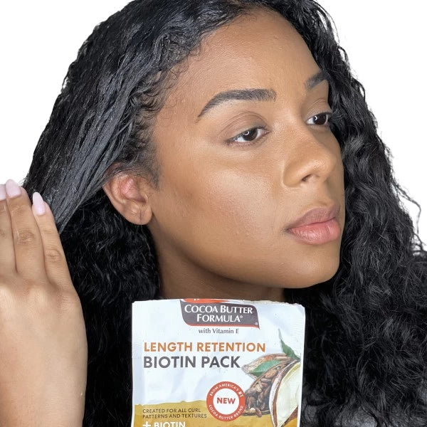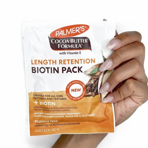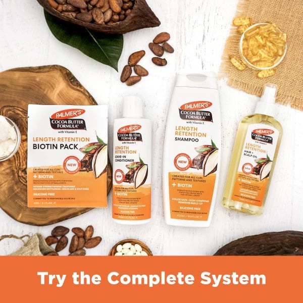 Palmer’s Cocoa Butter Formula® Length Retention system with Biotin, fully strengthens hair with powerhouse natural protectants that help block fragileness, brittleness, breakage and split ends, to help hair achieve its optimal length.