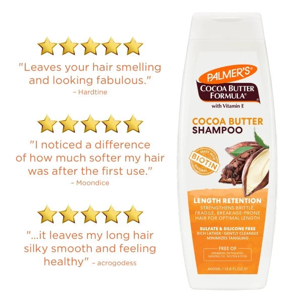 Palmer’s Cocoa Butter Formula® Length Retention system with Biotin, fully strengthens hair with powerhouse natural protectants that help block fragileness, brittleness, breakage and split ends, to help hair achieve its optimal length.