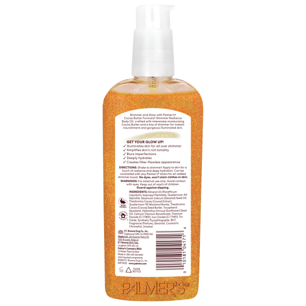 Shimmer and Glow with Palmer's Cocoa Butter Formula Shimmer Radiance Body Oil, crafted with intensively moisturizing Cocoa Butter and a kiss of shimmer for instant nourishment and gorgeous illuminated skin.