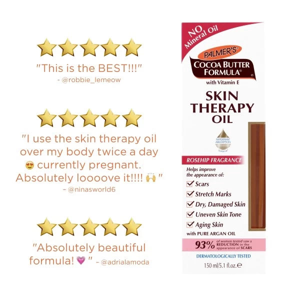 Palmer's Cocoa Butter Formula Skin Therapy Oil, Rosehip, is an advanced multi-purpose skin perfection product that can be used all over body and face. This preservative-free, phthalate free, lightweight formula contains an exclusive blend of key ingredients formulated to help improve the appearance of scars, stretch marks, dry, damaged skin, uneven skin tone, aging skin and fine lines and wrinkles. Skin looks and feels instantly soft and smooth with this unique, non-greasy, non-staining formula