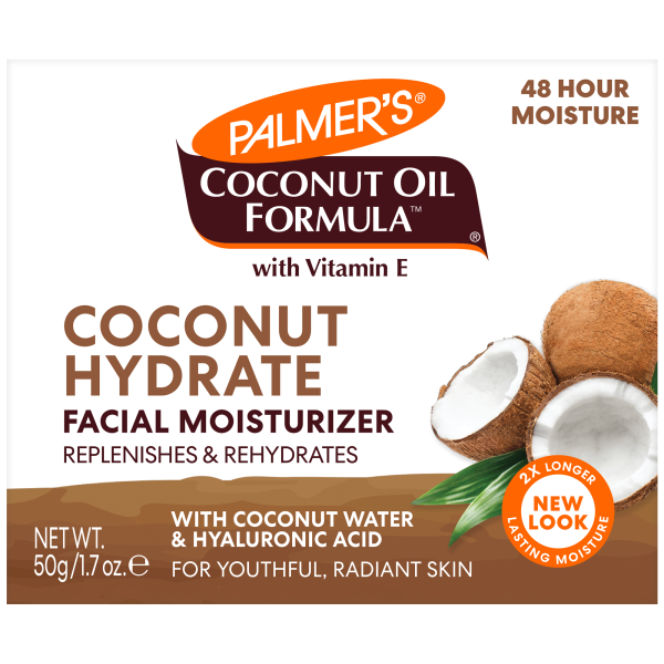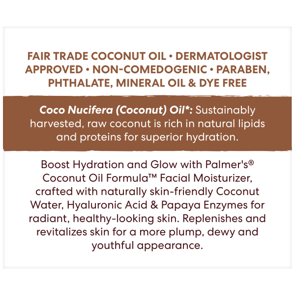 Palmer's Coconut Hydrate Facial Moisturizer drenches skin in naturally hydrating coconut water, hyaluronic acid and papaya enzymes to revitalize and replenish skin for a healthy-looking, dewy complexio