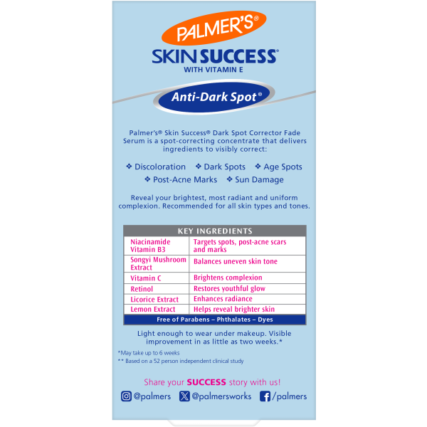 Palmer's Skin Success Dark Spot Corrector gves you your brightest, most radiant and uniform complexion by effectively correcting discoloration such as dark spots, age spots and uneven skin tone.