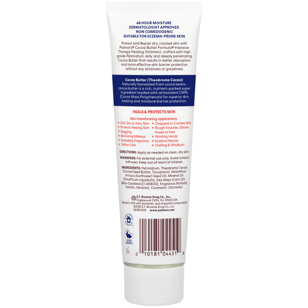 Protect and repair dry, cracked skin with Palmer's Cocoa Butter Formula Intensive Therapy Healing Ointment, crafted with high grade Petrolatum Jelly and deeply penetrating Cocoa Butter that results in better absorption and more effective skin barrier protection without any stickiness or greasines