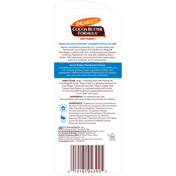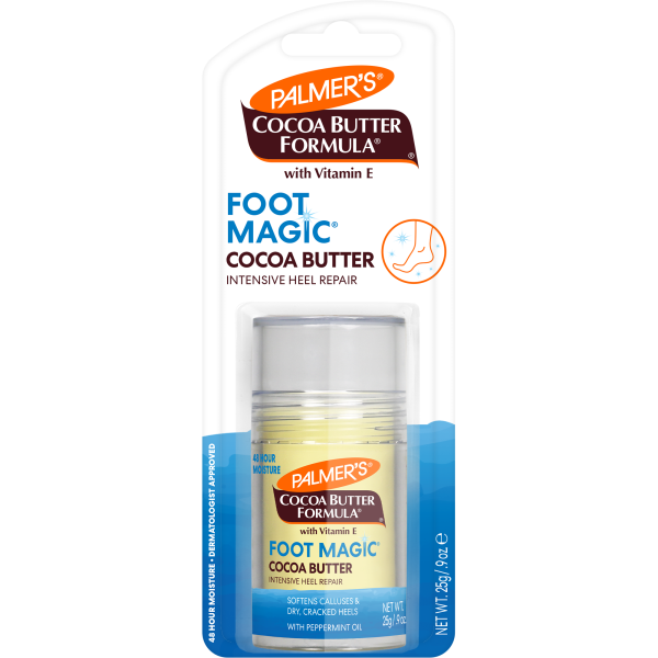 Specially formulated to soften and smooth dry, cracked or callused heels and feet, Palmer's Cocoa Butter Formula Heel Repair contains pure Cocoa Butter, Vitamin E, Shea Butter and Peppermint Oil in a convenient no-mess stick applicator