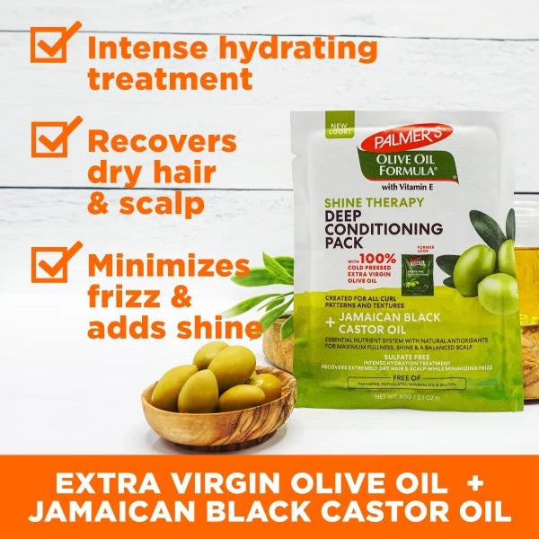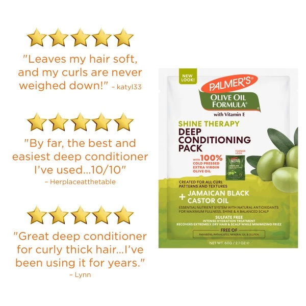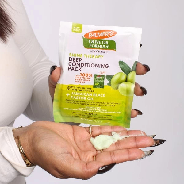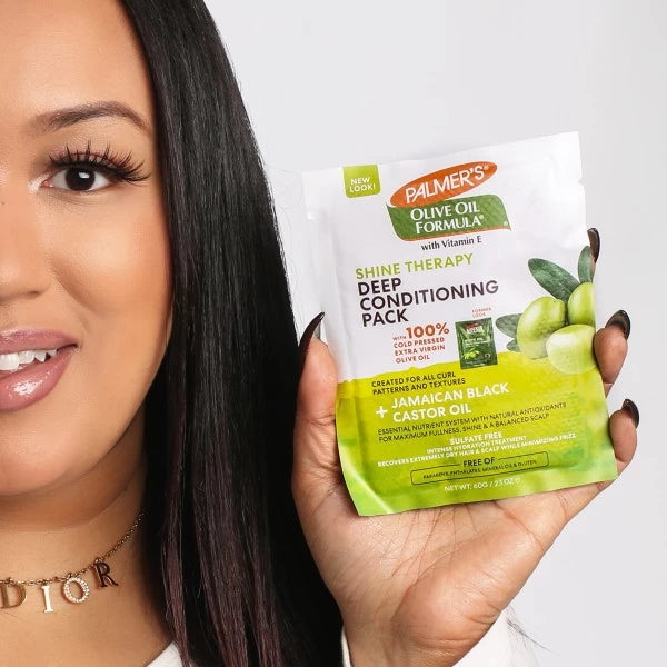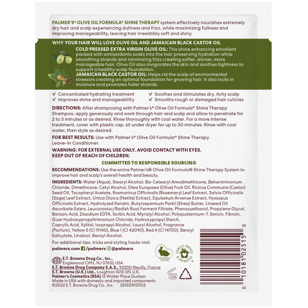 Palmer's Olive Oil Formula Shine Therapy perfectly nourishes dull, frizzy hair and dry scalp to maximize fullness and improve manageability, for irresistibly soft and shiny hair. Palmer's Olive Oil Formula Shine Therapy perfectly nourishes dull, frizzy hair and dry scalp to maximize fullness and improve manageability, for irresistibly soft and shiny hair. This shine enhancing emollient packed with antioxidants soaks into the hair preserving hydration while smoothing strands and minimizing frizz creating softer, shinier more manageable hair. Olive Oil also invigorates the skin and soothes tightness to support a healthy scalp foundation. Helps rid the scalp of environmental toxins creating an optimal foundation for growing hair. Jamaican Black Castor Oil also locks in moisture and promotes fuller strands.