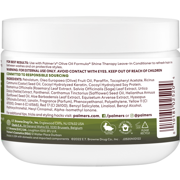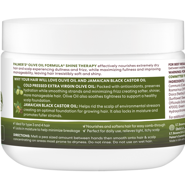 Palmer's Olive Oil Formula Shine Therapy perfectly nourishes dull, frizzy hair and dry scalp to maximize fullness and improve manageability, for irresistibly soft and shiny hair. This shine enhancing emollient packed with antioxidants soaks into the hair preserving hydration while smoothing strands and minimizing frizz creating softer, shinier more manageable hair. Olive Oil also invigorates the skin and soothes tightness to support a healthy scalp foundation. Helps rid the scalp of environmental toxins creating an optimal foundation for growing hair. Jamaican Black Castor Oil also locks in moisture and promotes fuller strands.