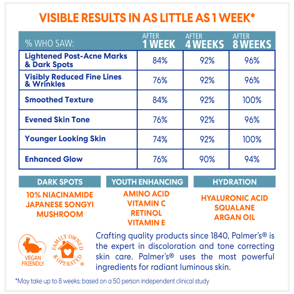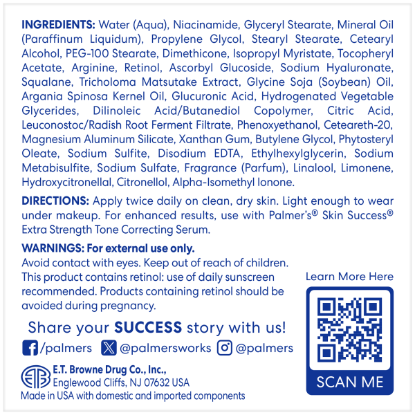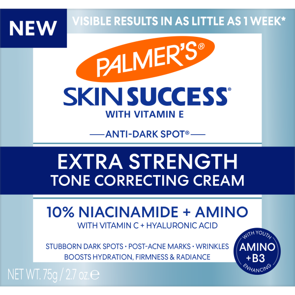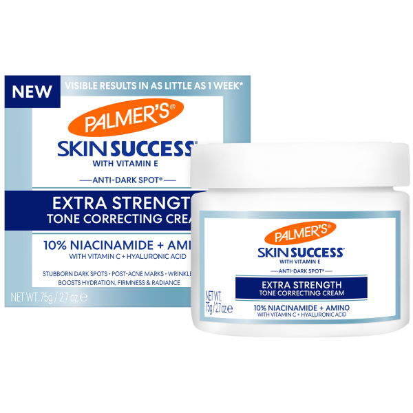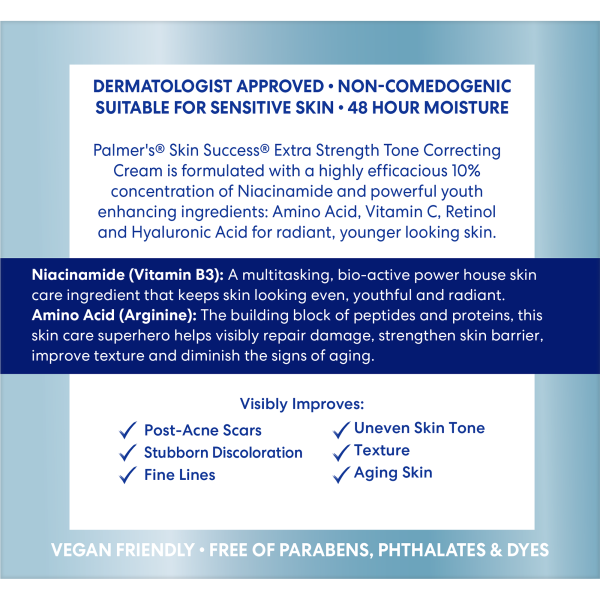 Palmer's Skin Success Extra Strength Tone Correcting Cream is formulated with a highly efficacious 10% concentration of Niacinamide and powerful youth enhancing ingredients: Amino Acid, Vitamin C, Retinol and Hyaluronic Acid for radiant, younger looking skin.  Visibly improves stubborn dark spots, post acne marks, and wrinkles while it boosts hydration, firmness and radiance.
