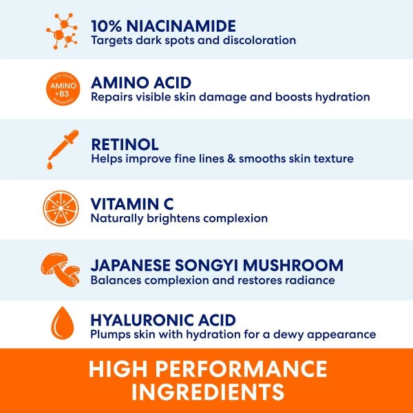 • Formulated with a powerful concentration of 10% Niacinamide, Amino Acid, Vitamin C, Retinol, and Hyalauronic Acid that targets discoloration, boosts firmness and moisturizes complexion for 48 hours